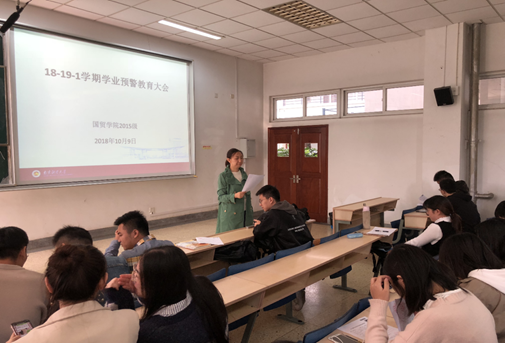 辅导员董敏老师对在座学生的学习成绩进行了通报,传达了预警内容及其重要性,明确了学校的学籍管理规定、毕业条件及学位授予条件。她提醒同学们,抓紧制定科学的学业规划;合理调整个人心理压力,适应不同阶段的专业学习任务。