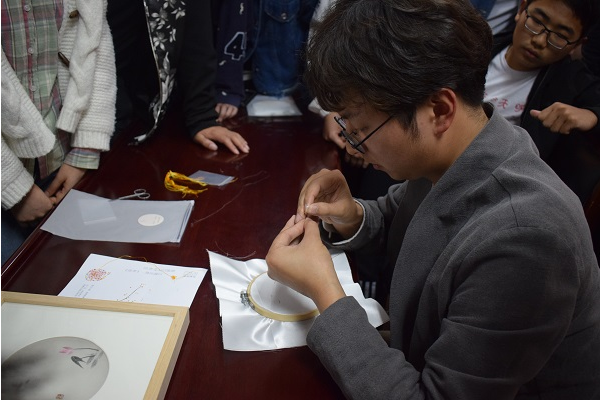 现场互动交流非常热烈,大家在张雪的指导下亲手拿起了针线和绷架。参加体验的潘同学说:“实在太奇妙了,一根普通的线可以分成几百股,一针针下去,可以出现这么精妙的图案,真可谓是用一针一线绣出来的文化传承呀!”一直围在张雪身边的陆同学表示:“张雪真的好棒,在文学爱好的基础上发挥了国贸专业的思维,永远积极主动在创新,以创新为乐,这是我们平常很难遇到的,这样的互动活动非常有感触!”