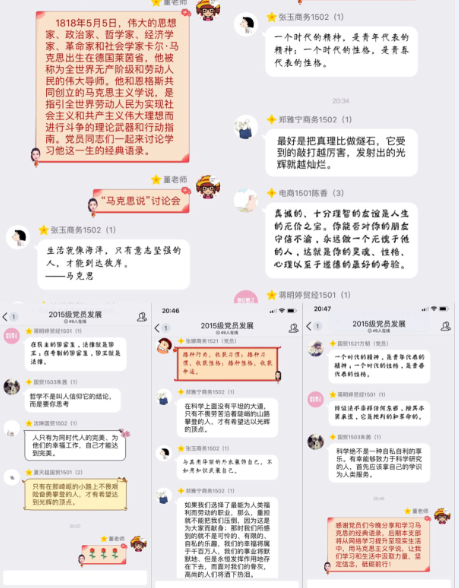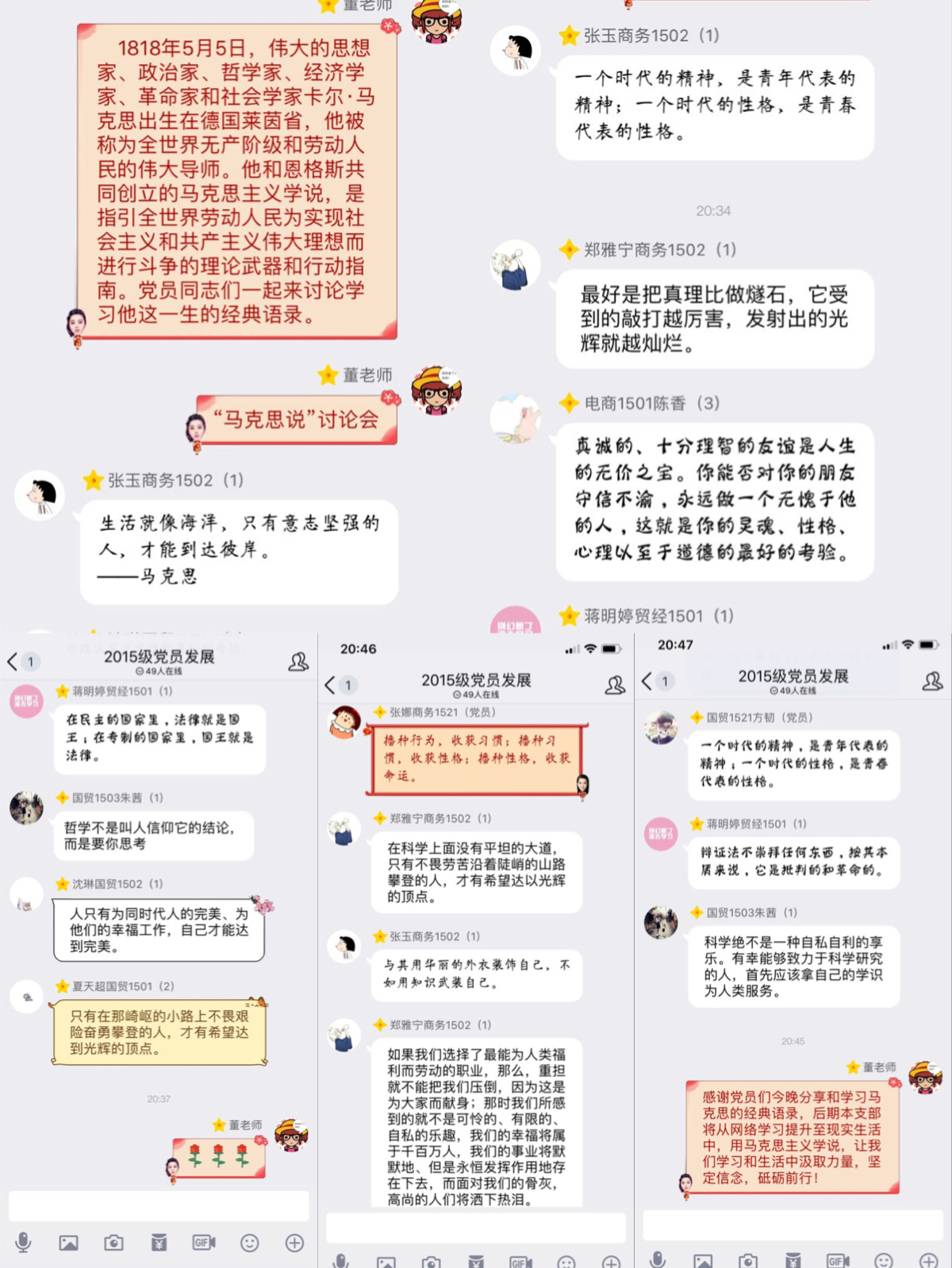 5月3日,2015级学生党支部书记董敏老师在线上发起了关于马克思经典语录的学习,学生党员们积极参与,踊跃发表自己认为最为经典的马克思话语。贸经1501班预备党员蒋明婷提出“在民主的国家里,法律就是国王;在专制的国家里,国王就是法律”,商务1502班预备党员郑雅宁认为“最好是把真理比做燧石,它受到的敲打越厉害,发射出的光辉就越灿烂”充分体现了马克思的真理论。