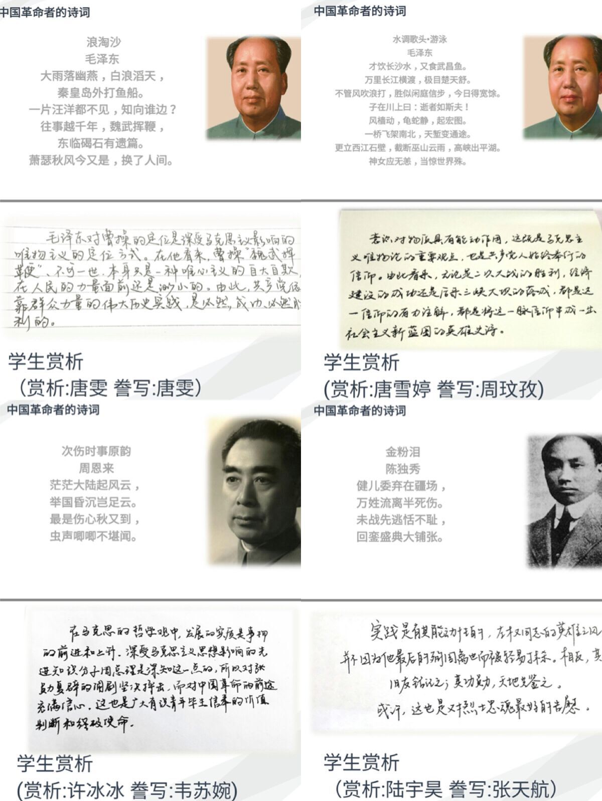 在对“一桥飞架南北,天堑变通途”的名句赏析中,来自贸易经济1602班的唐雪婷同学指出,这其实是“意识对物质的能动作用”这一马克思主义哲学基本原理的重要应用。她还敏锐地观察到,二次大战的胜利、经济建设的成功甚至于三峡大坝的建成,都与之密切相关。这也就能因马克思主义的基本原理“串成一出社会主义新蓝图的英雄史诗”。同样是对毛泽东名句的赏析,来自国贸实验班的唐雯同学却从《浪淘沙》之中看到了“唯物主义”的定位方式和思考模式,并严加推理,水到渠成地形成了“依靠群众力量的伟大历史实践,是必然成功、必然胜利的”。遵循马克思主义哲学脉络的许冰冰同学对周恩来总理的诗词作出了自己的鉴赏。在她看来,周总理当时所认定的发展观不仅包含对张勋复辟闹剧的抨击,也包含对中国革命发展前途的信心。对于中国马克思主义者的诗词作品,党的发展对象们都在体味,都在反思,都在感动。