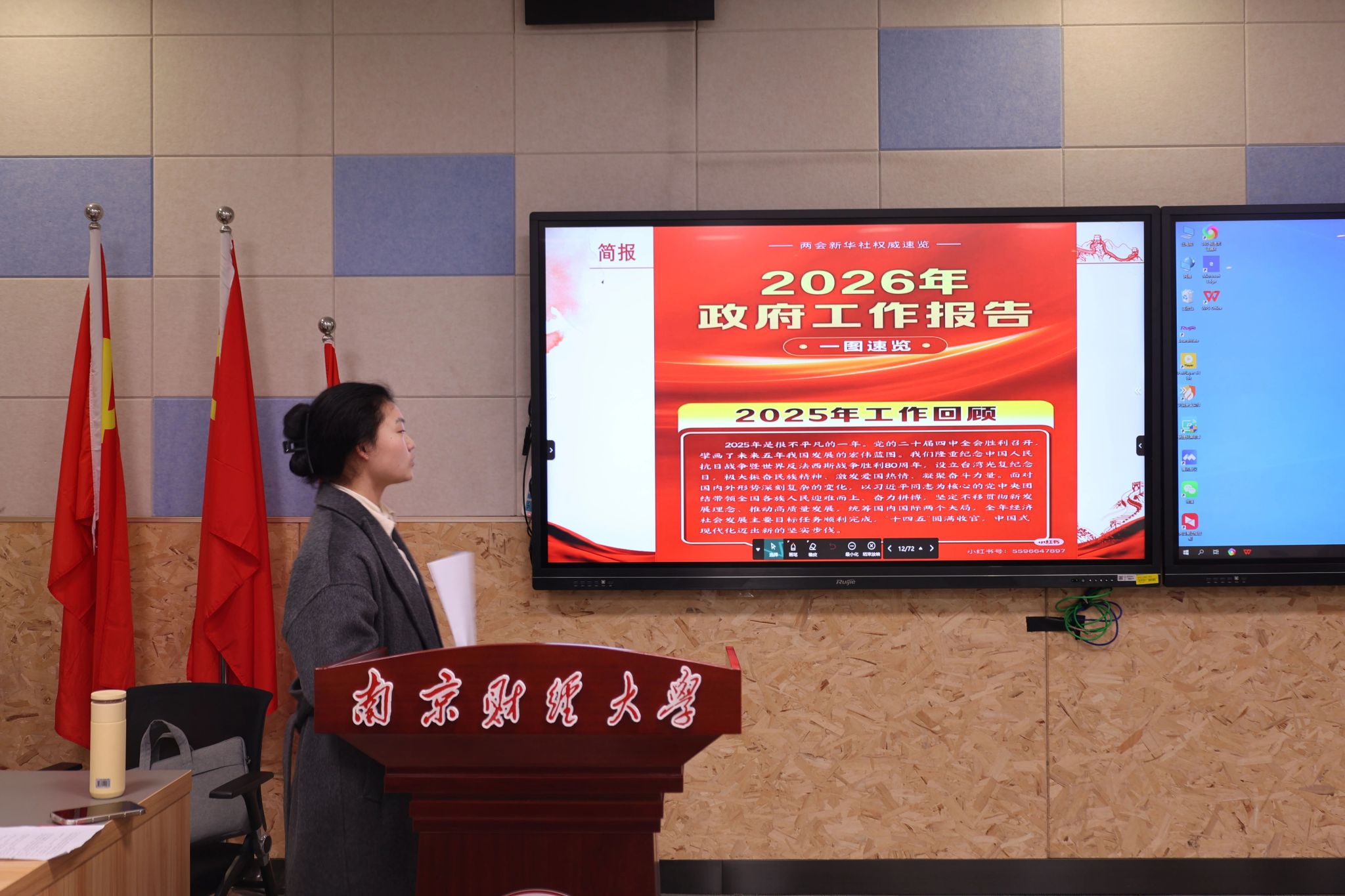 在“两会资讯,研学共读”环节,现场通过影像与文本结合的方式,开展沉浸式两会学习。精选的两会新闻视频、重要讲话片段,让学子们直观感受国家在新发展阶段的宏观布局;同步研读的两会权威简报、热词新词,则聚焦AI与就业、智能经济与商贸转型等核心议题,引导大家探讨如何调整知识结构以适配智能经济发展需求。当“人工智能相关人才缺口超500万”“青年就业支持体系持续完善”等两会民生关切与专业发展关联起来,学子们深刻认识到,国家对青年就业的“贴身关怀”,正是大家深耕专业、锤炼本领的底气。