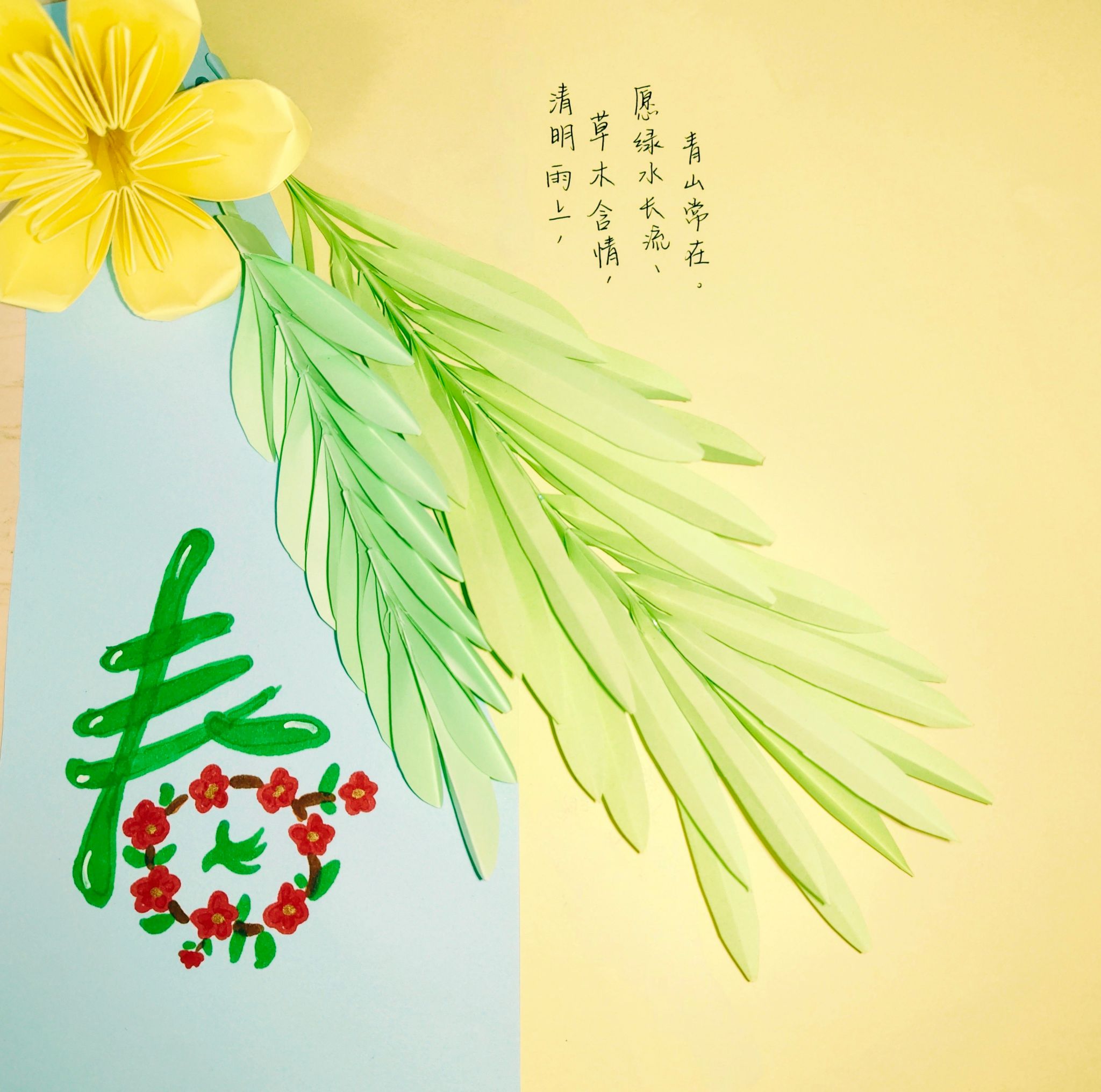 同步开展 “折柳寄思” 手工体验活动。折柳作为清明最古老的习俗之一,古人以折柳相赠,既取 “留” 之谐音寄托不舍,也借柳枝顽强生命力传递美好祝福。为践行环保理念,志愿者们用绿色彩纸代替柳枝,精心折叠、描画、拼接,将心意融入指尖。大家在作品上写下真挚祈愿,或盼 “清明雨上,草木含情,愿绿水长流、青山常在”,或借樱花喻人,感慨 “樱花七日,绚烂至极而归于沉寂,恰如生命之短暂与珍贵”,字里行间既饱含青春朝气,更藏着对传统习俗的敬畏与对生命、自然的深切感悟。
