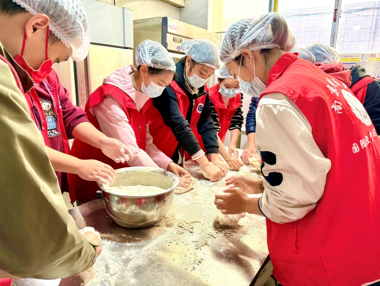 10月24日上午,老年食堂内暖意融融,热闹非凡。志愿者们身着红色志愿服,分工协作、各司其职,一组负责打扫地面、擦拭桌椅、整理餐具;另一组则进入后厨,协助工作人员洗菜、切菜、揉面。在馒头制作环节,志愿者们围在操作台前跟着食堂师傅学习技巧,经过反复揉捏、细心塑形,一个个圆润饱满的馒头整齐排列在蒸笼里。后厨内,厨具碰撞声与欢声笑语交织,整个食堂洋溢着温馨的协作氛围。